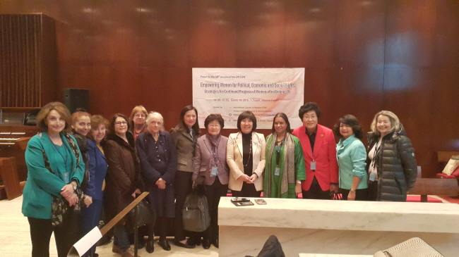 한국여성단체협의회는 3월 9일부터 20일까지 뉴욕 유엔본부에서 열린 제59차 UN 여성지위위원회(UN Commission on the Status of Women)에 대표단을 파견했다. 유엔 여성지위위원회(CSW)는 유엔경제사회이사회(ECOSOC) 산하의 기능 위원회로서 해마다 국제기구와 각 국 정부 대표단을 비롯한, 비정부기구(NGO) 참가자가 모여 여성 권익 증진을 위한 정책 사례를 공유하고 보다 효과적인 정책 이행 방안을 모색하는 회의를 개최한다. 매년 UN CSW에 참가하여 NGO 워크숍을 진행해 온 한국여성단체협의회는 3월 16일 유엔 Church 센터에서 “정치경제사회적 권리를 위한 여성의 역량강화: 베이징+20 이후 여성의 지속 가능한 발전을 위한 전략 (Empowering Women for Political, Economic and Social Rights: Strategies for Continued Progress of Women after Beijing+20)”을 주제로 포럼을 개최하였다. 이번 포럼에는 세계여성단체협의회(ICW) 임원진과 국제존타, 세계전문직여성클럽(BPW), 국제여학사협회 등의 국제단체 지도자를 비롯한 미국, 영국 프랑스, 뉴질랜드, 캐나다, 대만의 여성단체협의회 회장 등 150여명의 세계 여성지도자들이 참여하여 성황을 이루었다. 대만여성단체협의회 Linda Liu 회장의 사회로 시작된 포럼은 한국여성단체협의회 김정숙 전회장, 세계여성지도자회의(Global Summit of Women) Irene Natividad 회장의 강연에 이어 Ranjana Kumari 인도사회문제연구센터 소장, 주준희 여성협상리더십 원장의 발제와 토론의 순으로 진행되었다. 특히 이번 NGO 워크숍에서는 이연숙 전 제2정무 장관, 남인순 의원, 박영혜 전BPW 한국연맹회장, Pam Rajput 인도 여성지위위원회 위원장 및 Mitsuko Horiuchi 분쿄가쿠인대학교 교수가 토론자로 참가하여 아태 지역 정치와 경제분야의 여성 역량강화를 주제로 한 심화토론이 함께 진행되어 실질적인 양성평등을 달성하기 위해 베이징 행동강령이 추구하는 성주류화 전략의 보다 실효성 있는 이행방안을 논의하는 계기가 되었다.