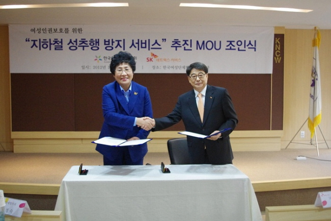 2012년 1월 17일(화) 오후 3시 한국여성단체협의회 2층 강당에서 한국여성단체협의회와 SK 네트웍스서비스(주)(대표 배영진)간의 ‘지하철 성추행 방지 서비스 MOU 체결식’이 거행되었다. SK 네트웍스서비스(주)가 개발한 지하철 성추행 방지 서비스는 단순한 이윤 추구의 목적이 아니라 여성들의 권익 보호라는 공익을 위해 개발한 것으로, 간단한 애플리케이션을 스마트폰에 다운받아 실행시키면 지하철 성추행 사건이 발생할 때 인근 수사대에 빠르게 신고할 수 있다. 그동안 지하철 성추행의 빈번한 발생에도 불구하고 복잡한 신고절차 과정에서 가해자와 시비가 붙을 것을 우려하거나 주변에 알려질 경우 느끼게 되는 수치심 때문에 피해 여성이 신고를 꺼리는 경우가 많다는 것이 꾸준히 문제점으로 지적되어 왔는데, 이 서비스를 이용하면 누구든지 한 번의 터치만으로 간편하게 신고할 수 있으므로 지하철 성추행 방지에 매우 큰 효과가 있을 것으로 기대된다. 전국 67개 회원단체, 700만 회원으로 구성된 한국여성단체협의회와 평소 경영활동을 통한 가치 창출로 사회 전체의 행복에 기여한다는 윤리경영을 표방하고 있는 SK 네트웍스서비스(주)는 이번 MOU 체결을 계기로 대한민국의 모든 여성들의 인권을 보호하고 성추행 위험으로부터 벗어나 보다 안심하고 편리하게 대중교통을 이용할 수 있도록 적극 협조해 나갈 것이다.