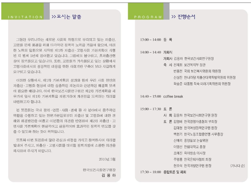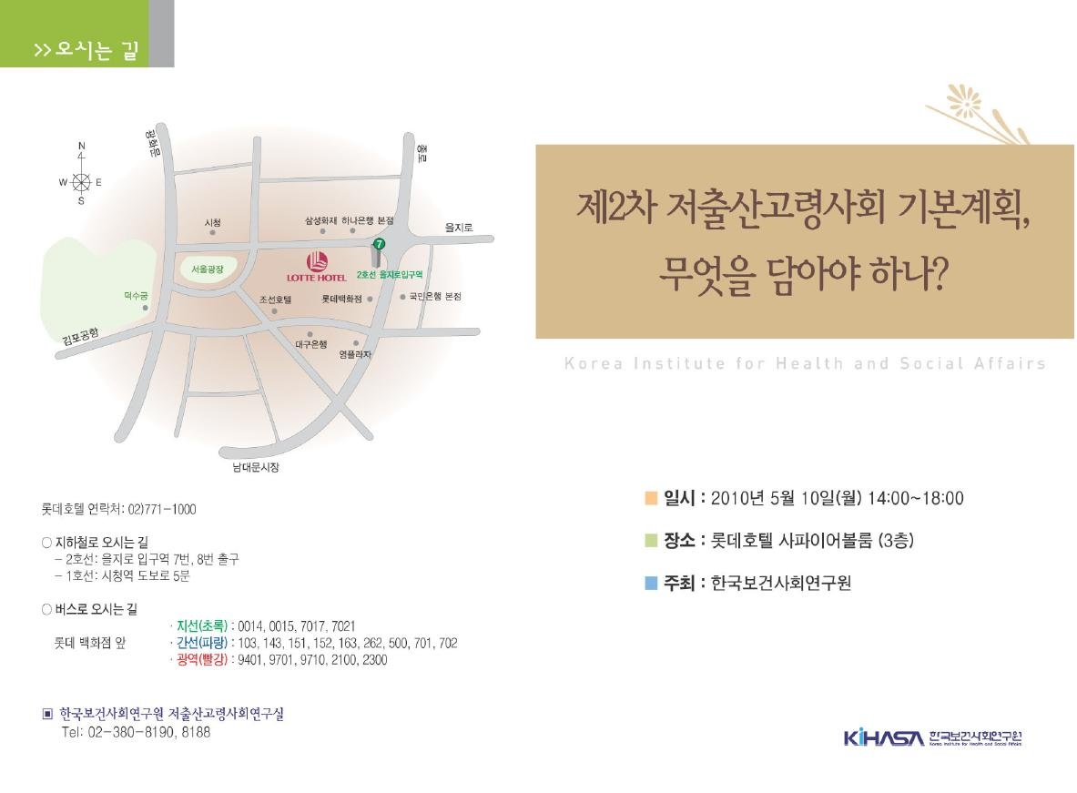 한국보건사회연구원 주최 '제2차 저출산고령사회 기본계획 수립 관련 토론회'를 하오니 많은 분들의 관심과 참석 부탁드립니다.◈일 시 : 2010년 5월 10일(월) 14:00 ~ 18:00◈장 소 : 롯데호텔 사파이어볼룸(3층)
